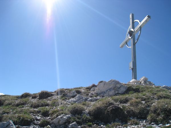 Nach einer schönen Rast in der Sonne wandern wir weiter zur Lapedurscharte mit Blick auf den Piz da Peres und weiter zur Flatschkofel-Scharte, 2223 m. Unser erstes Gipfelziel, den Maurerkopf, 2567 m, erreichen wir weglos und folgen von dort dem schmalen Steig, den Kamm entlang, hinüber zur Hochalmspitze, auch Hochalpenkopf, 2542 m. Die Aussicht am Gipfelkreuz ist überwältigend schön – besonders wenn man dort alleine steht.